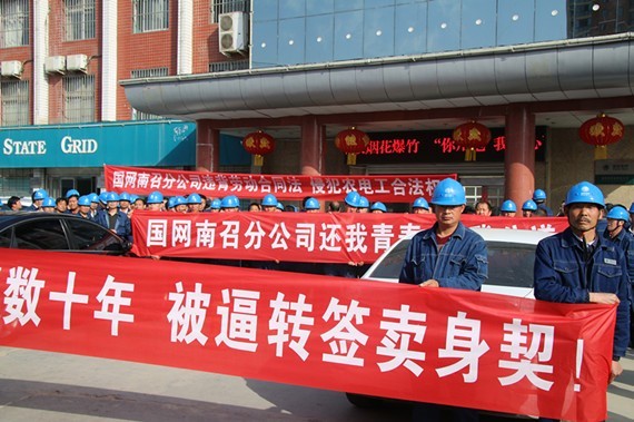 据央媒记者爆料,2017年4月24日,河南省南召县供电公司门外近百名身着蓝色工装、头戴安全帽的农电工,手拉红色条幅抗议该公司逼迫签定“卖身契”,引起路人围观。条幅内容显示:农电工风雨数十年,被逼转签“卖身契”;国家电网南召分公司违反劳动法;国家电网南召分公司还我青春。